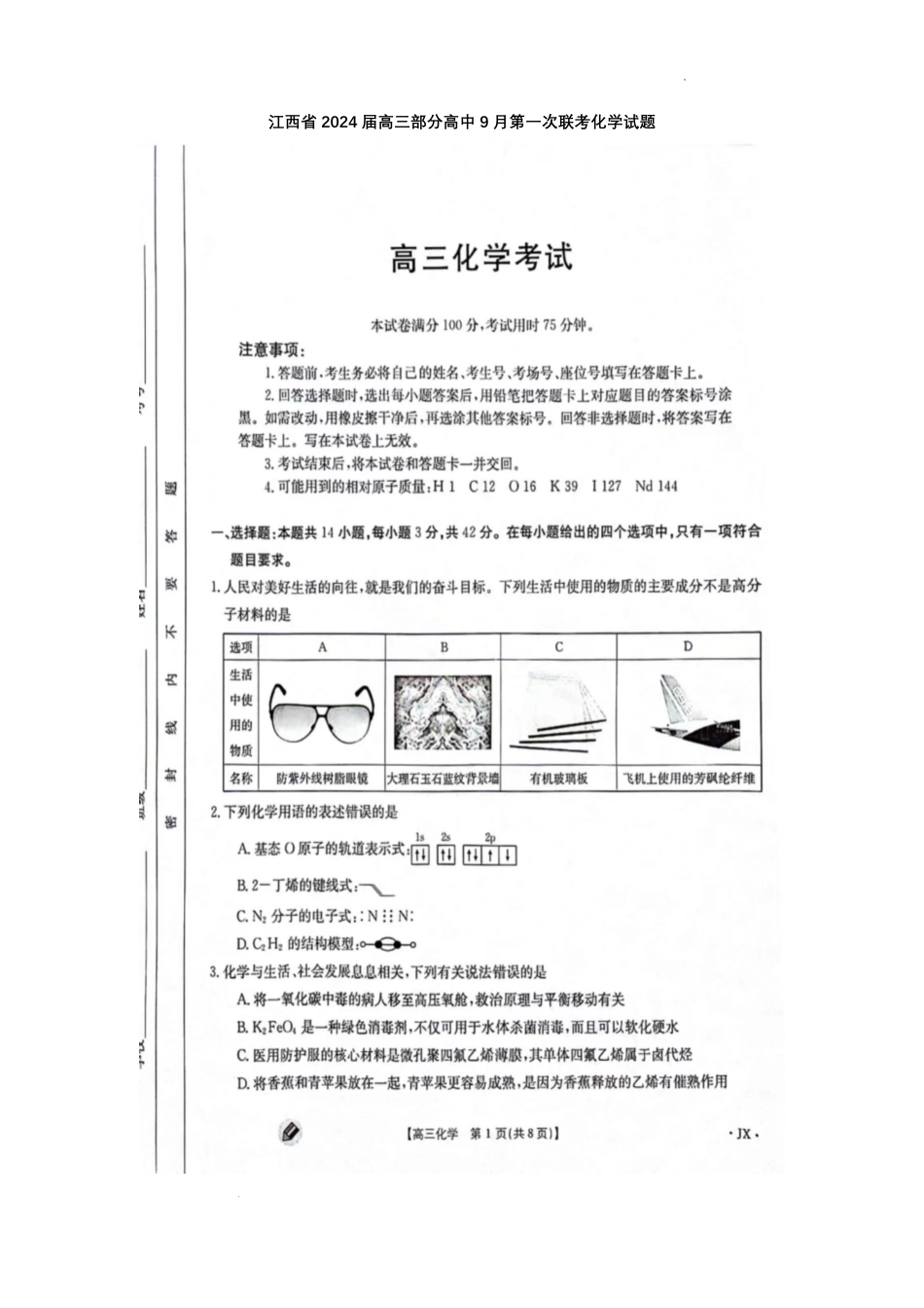 学科网(北京)股份有限公司江西省2024届高三部分高中9月第一次联考化学试题学科网(北京)股份有限公司学科网(北京)股份有限公司学科网(北京)股份有限公司学科网(北京)股份有限公司学科网(北京)股份有限...