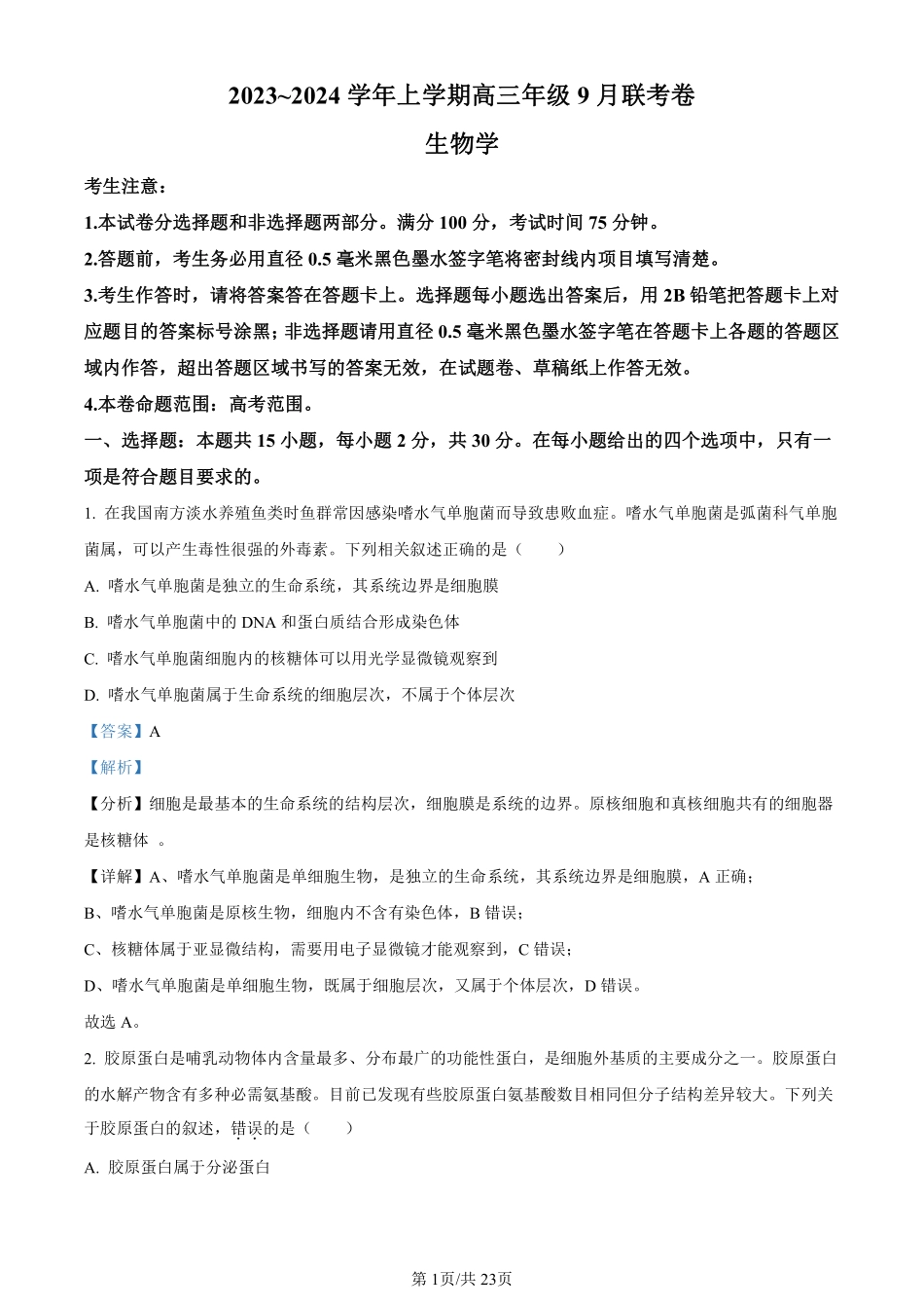 第1页/共23页学科网(北京)股份有限公司2023~2024学年上学期高三年级9月联考卷生物学考生注意:1.本试卷分选择题和非选择题两部分。满分100分,考试时间75分钟。2.答题前,考生务必用直径0.5毫米黑色墨水签字笔...