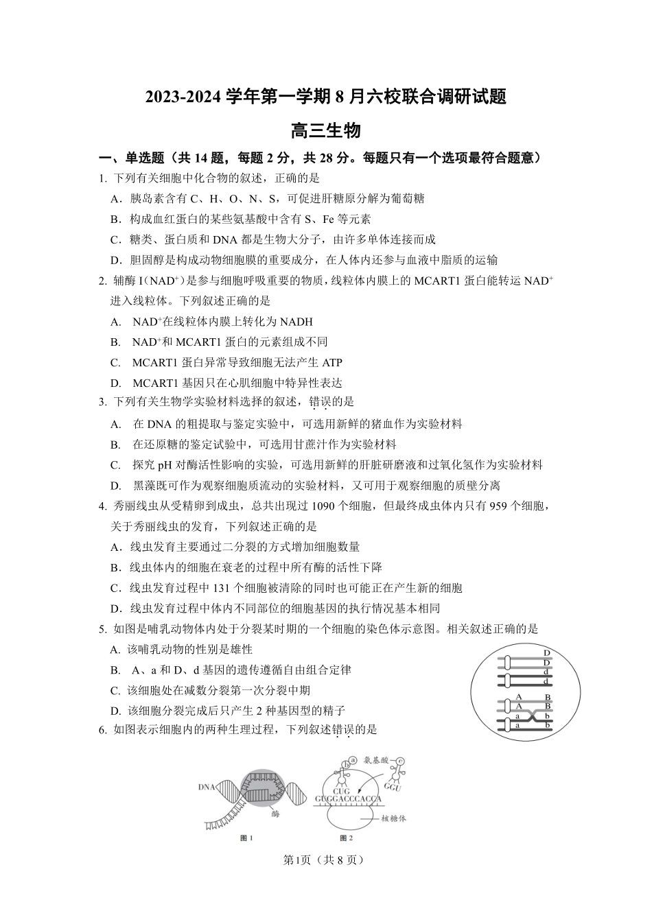 第页(共8页)12023-2024学年第一学期8月六校联合调研试题高三生物一、单选题(共14题,每题2分,共28分。每题只有一个选项最符合题意)1.下列有关细胞中化合物的叙述,正确的是A.胰岛素含有C、H、O、N、S,可促...