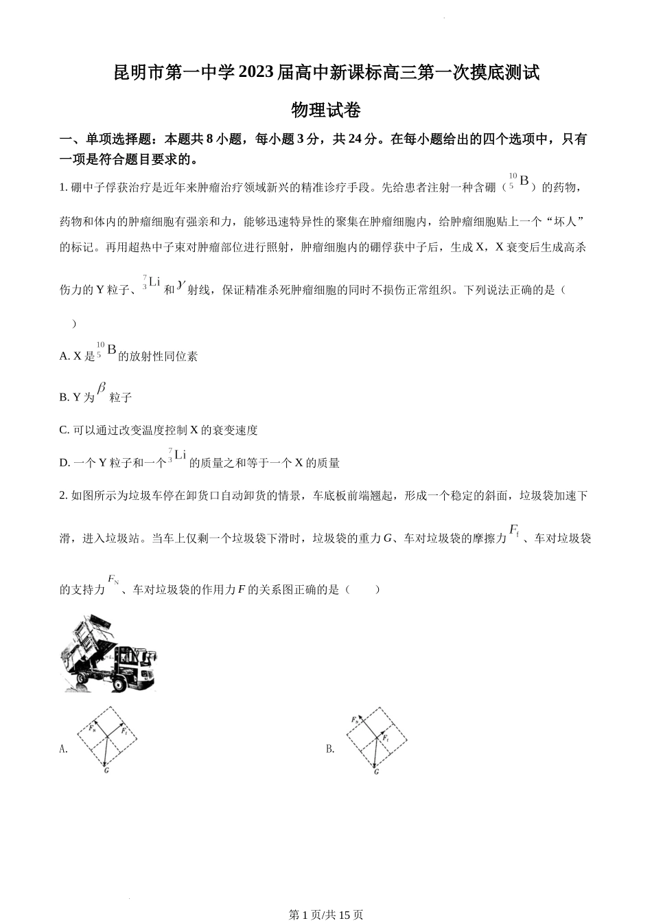 昆明市第一中学2023届高中新课标高三第一次摸底测试物理试卷一、单项选择题:本题共8小题,每小题3分,共24分。在每小题给出的四个选项中,只有一项是符合题目要求的。1.硼中子俘获治疗是近年来肿瘤治疗领域新兴...