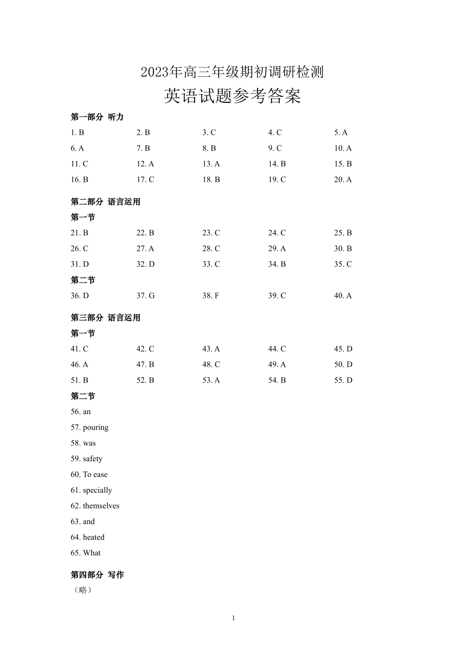 12023年高三年级期初调研检测英语试题参考答案第一部分听力1.B2.B3.C4.C5.A6.A7.B8.B9.C10.A11.C12.A13.A14.B15.B16.B17.C18.B19.C20.A第二部分语言运用第一节21.B22.B23.C24.C25.B26.C27.A28.C29.A30.B31.D32.D3...