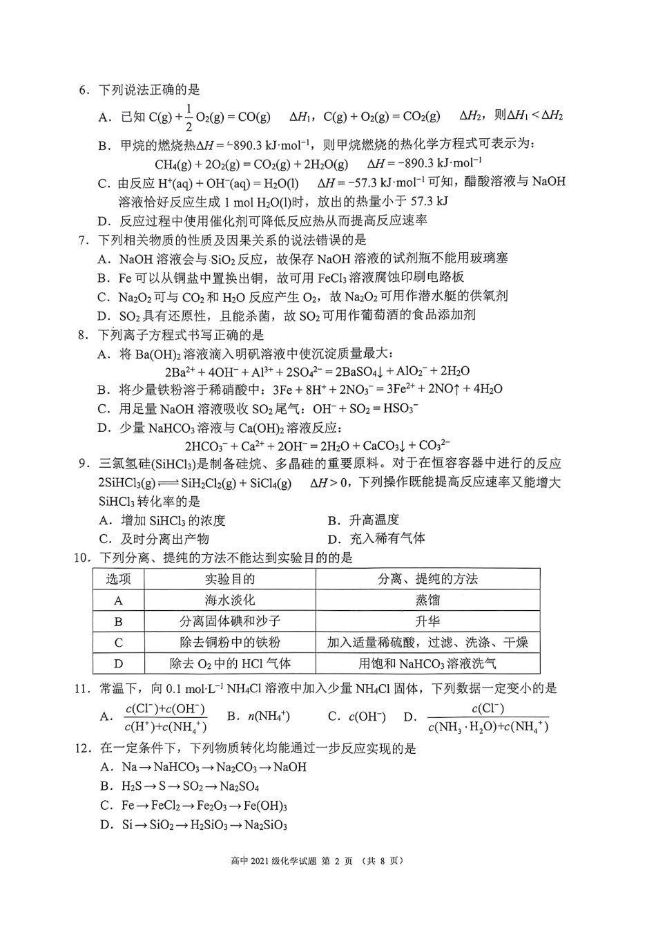 四川省成都市蓉城联盟2024届高三上学期开学考试 化学.pdf_第2页