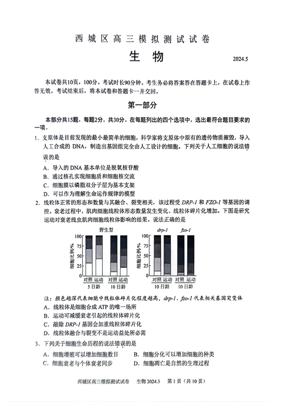2024北京西城高三二模生物试题及答案.pdf_第1页
