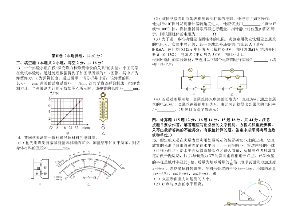 开远一中2024届高三年级开学考试物理试卷(本试卷分为第I卷和第II卷两个部分,满分:100分考试用时:90分钟)注意事项:1.答卷前,考生务必将自己的相关信息填写在答题卡相应位置上。2.作答时,将答案填写在答题...