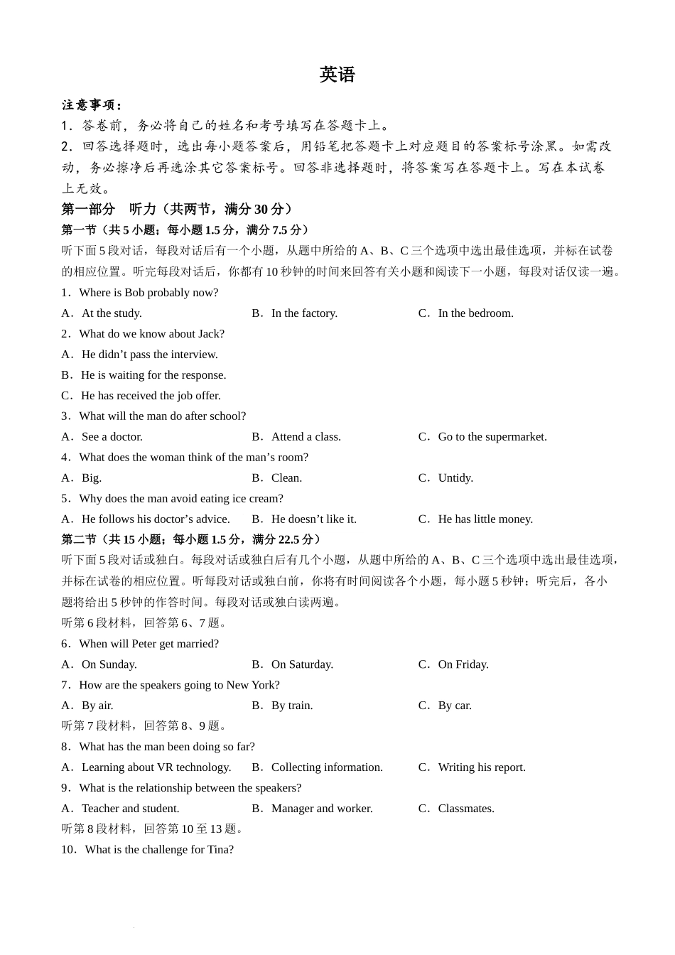 英语注意事项:1.答卷前,务必将自己的姓名和考号填写在答题卡上。2.回答选择题时,选出每小题答案后,用铅笔把答题卡上对应题目的答案标号涂黑。如需改动,务必擦净后再选涂其它答案标号。回答非选择题时,将...