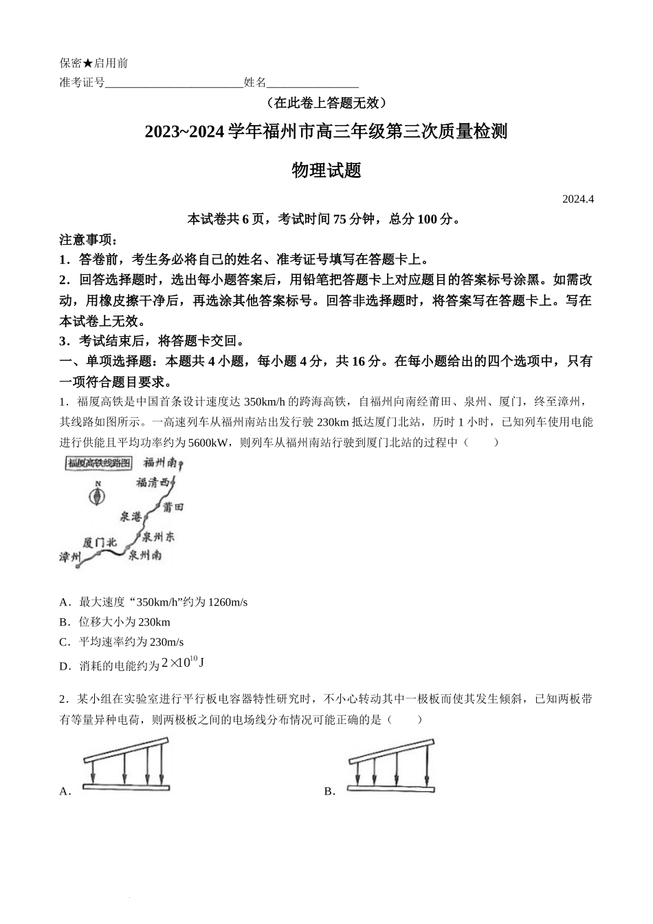 保密★启用前准考证号________________________姓名________________(在此卷上答题无效)2023~2024学年福州市高三年级第三次质量检测物理试题2024.4本试卷共6页,考试时间75分钟,总分100分。注意事项:1.答卷...