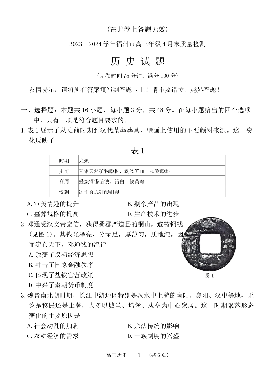 (在此卷上答题无效)2023–2024学年福州市高三年级4月末质量检测历史试题(完卷时间75分钟;满分100分)友情提示:请将所有答案填写到答题卡上!请不要错位、越界答题!一、选择题:本题共16小题,每小题3分,共48分...