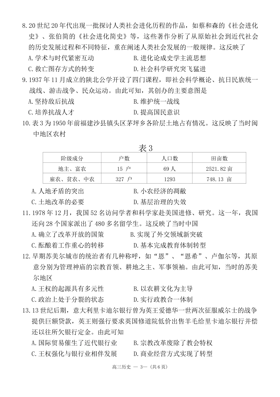 2024届福建省福州市高三下学期4月末质量检测(三模)历史试题+答案.docx_第3页