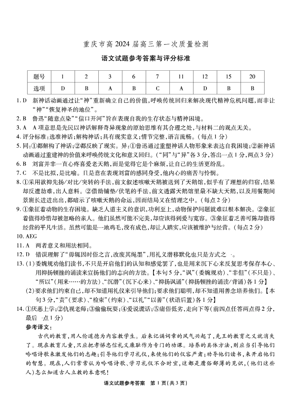 重庆市南开中学校2023-2024学年高三上学期开学考试 语文答案.pdf_第1页