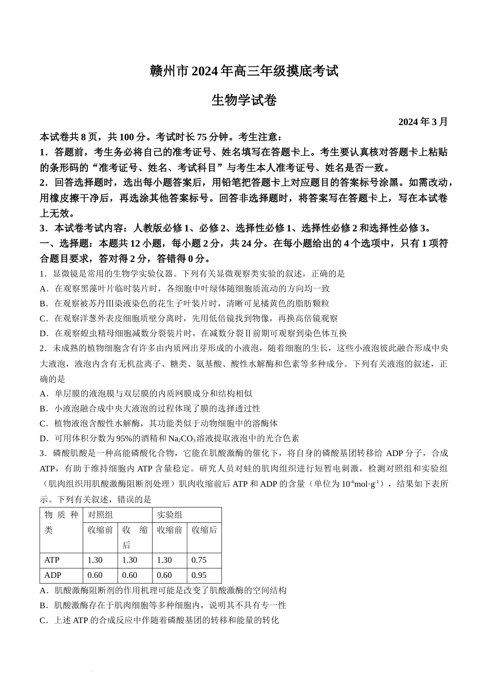 赣州市2024年高三年级摸底考试生物学试卷2024年3月本试卷共8页,共100分。考试时长75分钟。考生注意:1.答题前,考生务必将自己的准考证号、姓名填写在答题卡上。考生要认真核对答题卡上粘贴的条形码的“准考证...
