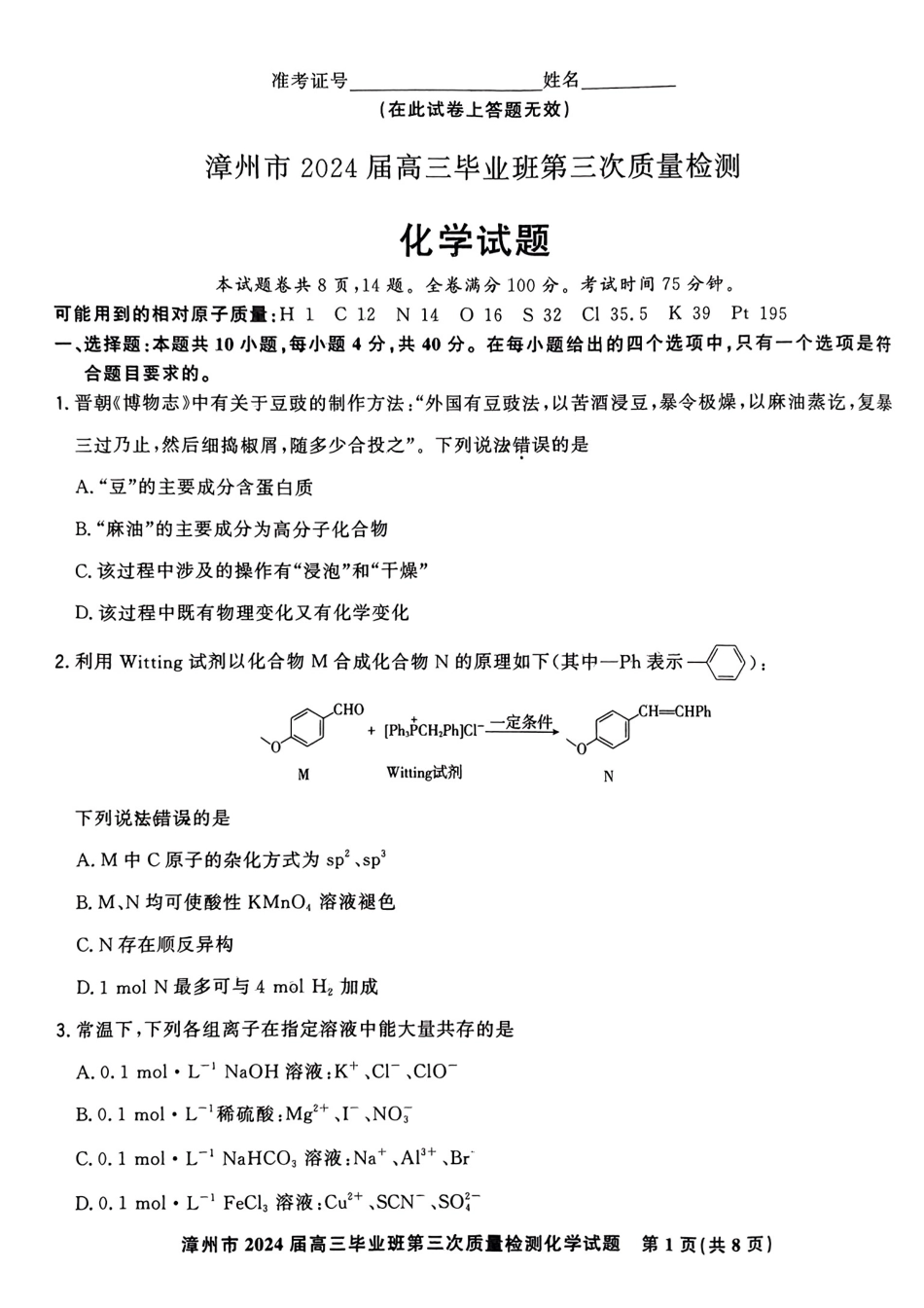 福建省漳州市2024届高三毕业班第三次质量检测 化学.pdf_第1页