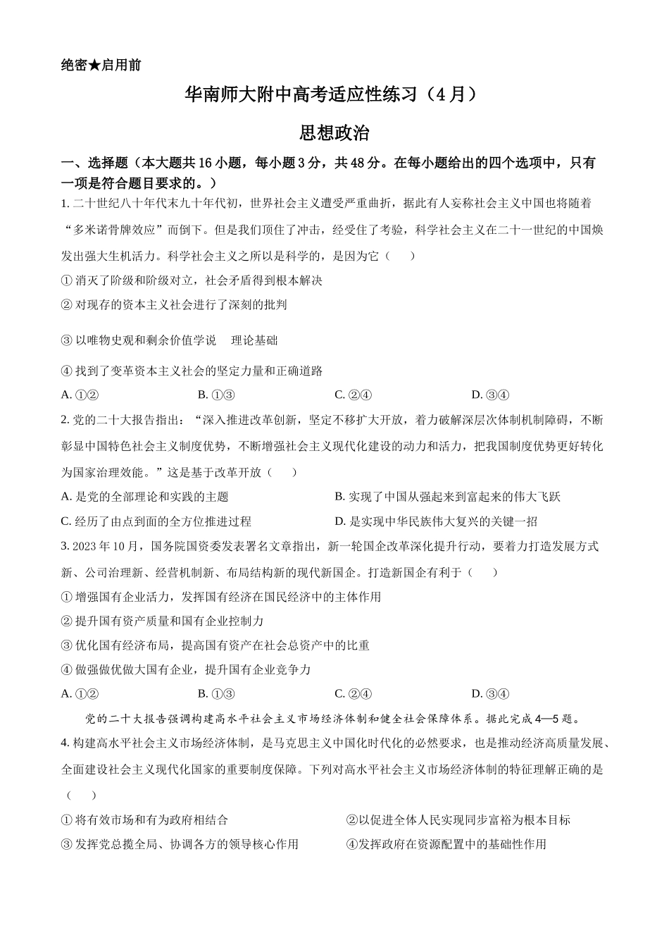 广东省华南师范大学附属中学2023-2024学年高三下学期4月高考适应性练习 政治 Word版含解析.docx_第1页