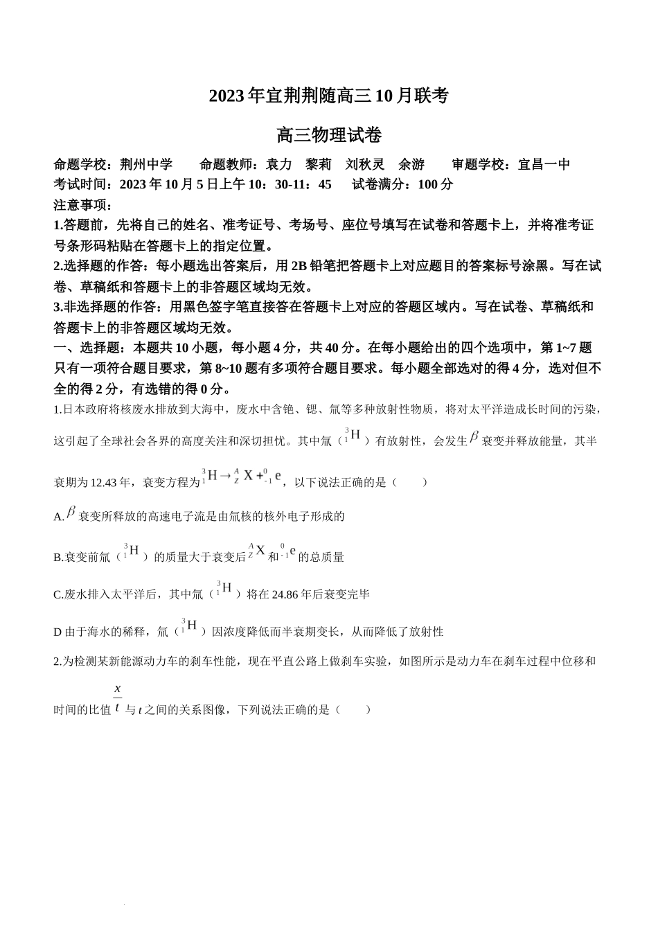 2023年宜荆荆随高三10月联考高三物理试卷命题学校:荆州中学命题教师:袁力黎莉刘秋灵余游审题学校:宜昌一中考试时间:2023年10月5日上午10:30-11:45试卷满分:100分注意事项:1.答题前,先将自己的姓名、准考...