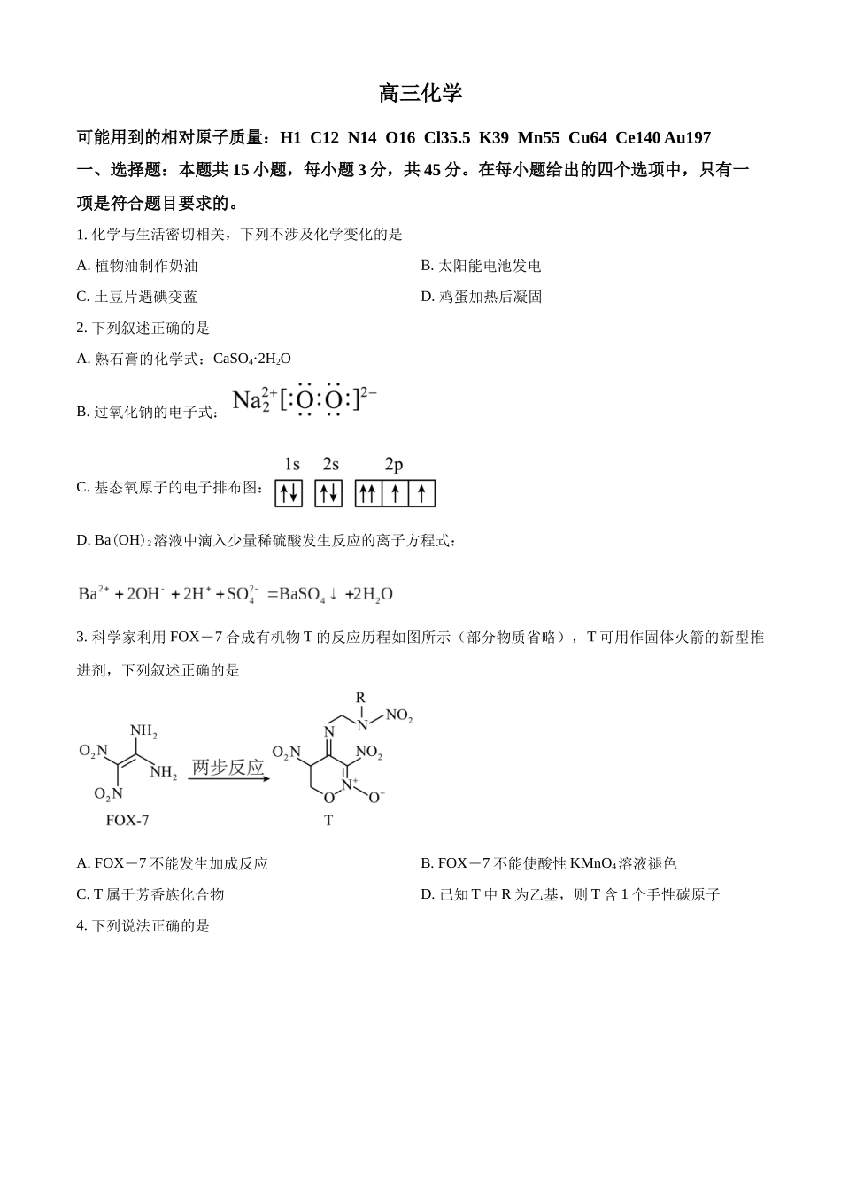 高三化学可能用到的相对原子质量:H1C12N14O16Cl35.5K39Mn55Cu64Ce140Au197一、选择题:本题共15小题,每小题3分,共45分。在每小题给出的四个选项中,只有一项是符合题目要求的。1.化学与生活密切相关,下列不涉...