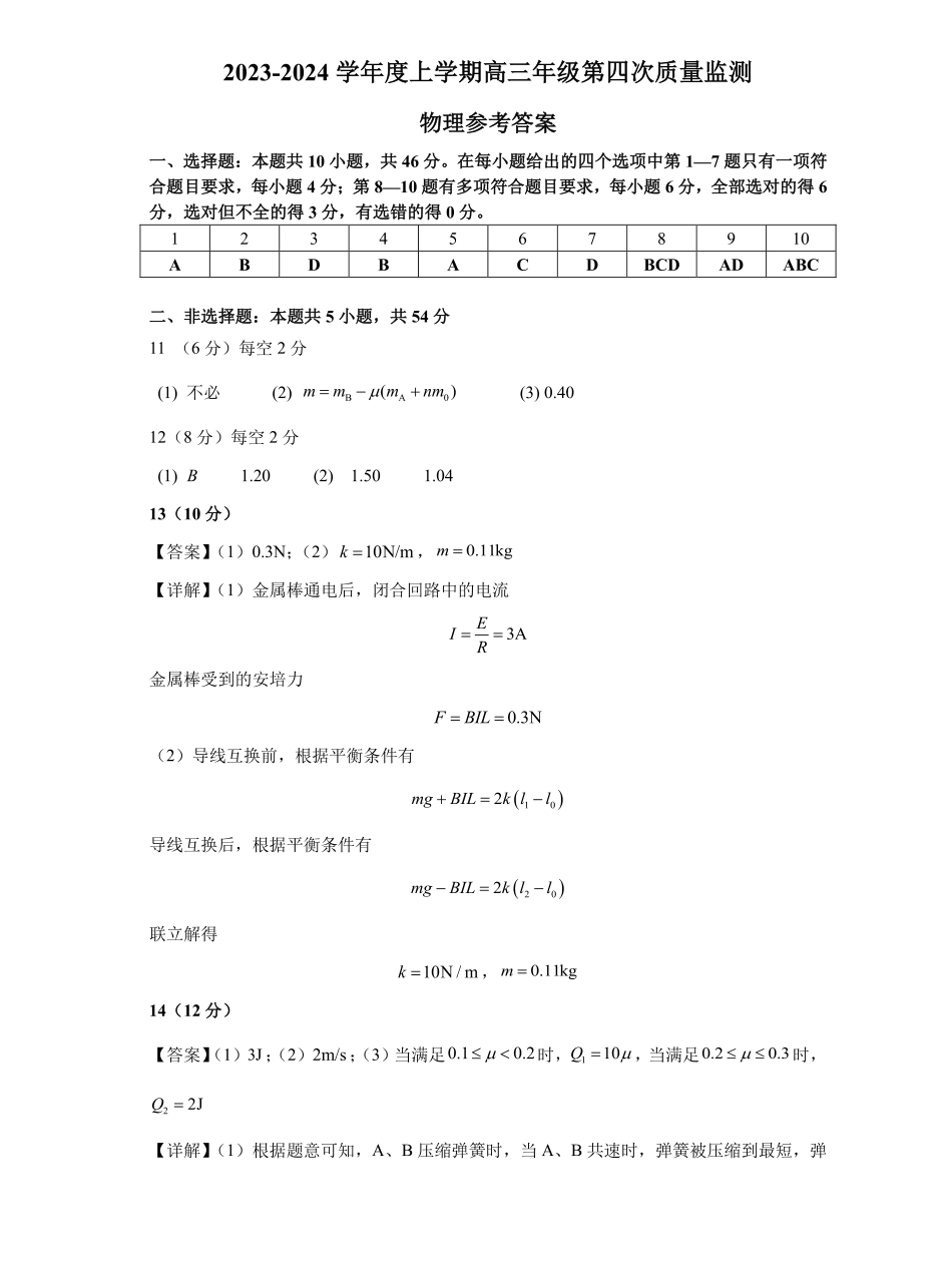 辽宁省沈阳市第一二〇中学2023-2024学年高三上学期第四次质量监测 物理答案.pdf