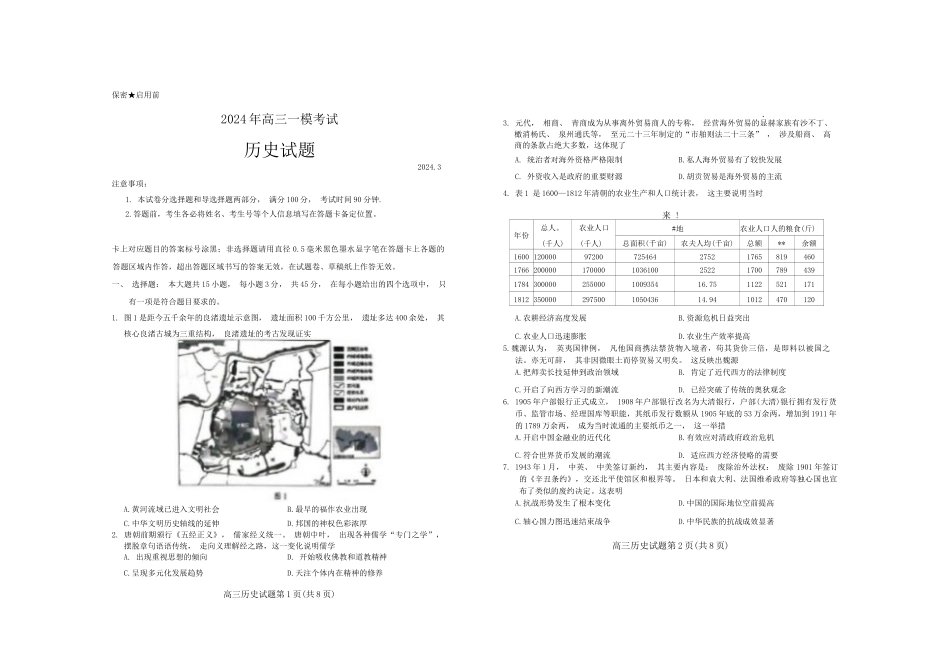 保密★启用前2024年高三一模考试历史试题2024.3注意事项:1.本试卷分选择题和导选择题两部分,满分100分,考试时间90分钟.2.答题前,考生各必将姓名、考生号等个人信息填写在答题卡备定位置。卡上对应题目的答案...