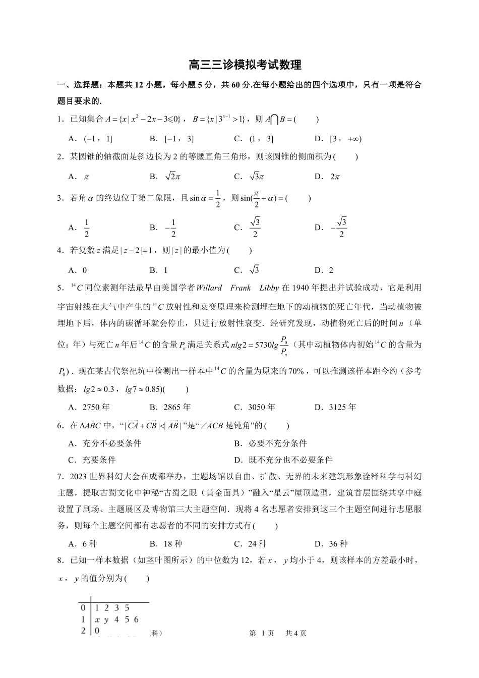 高三数学试题(理科)第页共4页1高三三诊模拟考试数理一、选择题:本题共12小题,每小题5分,共60分.在每小题给出的四个选项中,只有一项是符合题目要求的.1.已知集合2{|230}Axxx„,1{|31}xBx,则(...