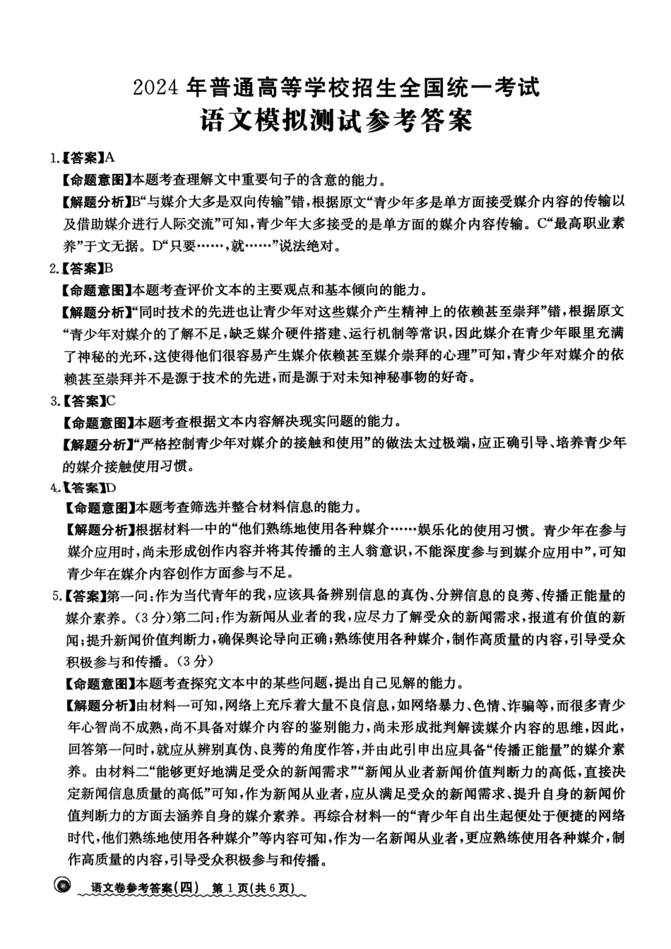 2024届河北省高三下学期普通高中学业水平选择性考试 语文参考答案.pdf_第1页