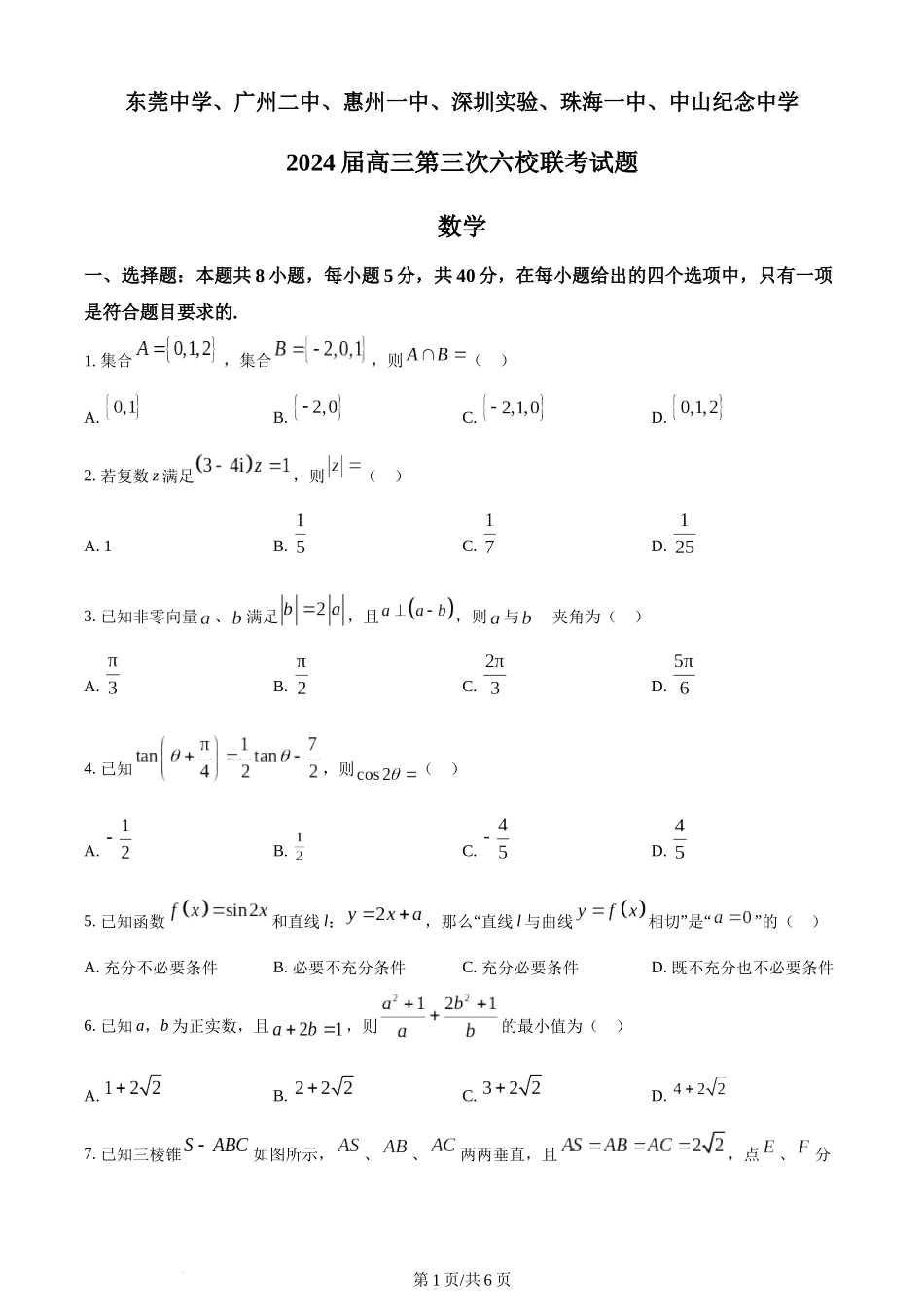 广东省东莞中学、广州二中、惠州一中、深圳实验、珠海一中、 中山纪念中学2024届高三第三次六校联考 数学.docx_第1页