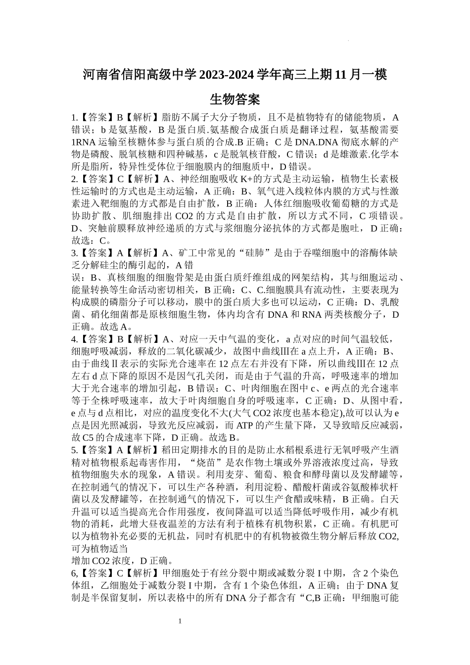 1河南省信阳高级中学2023-2024学年高三上期11月一模生物答案1.【答案】B【解析】脂肪不属子大分子物质,且不是植物特有的储能物质,A错误;b是氨基酸,B是蛋白质.氨基酸合成蛋白质是翻译过程,氨基酸需要1RNA运输...