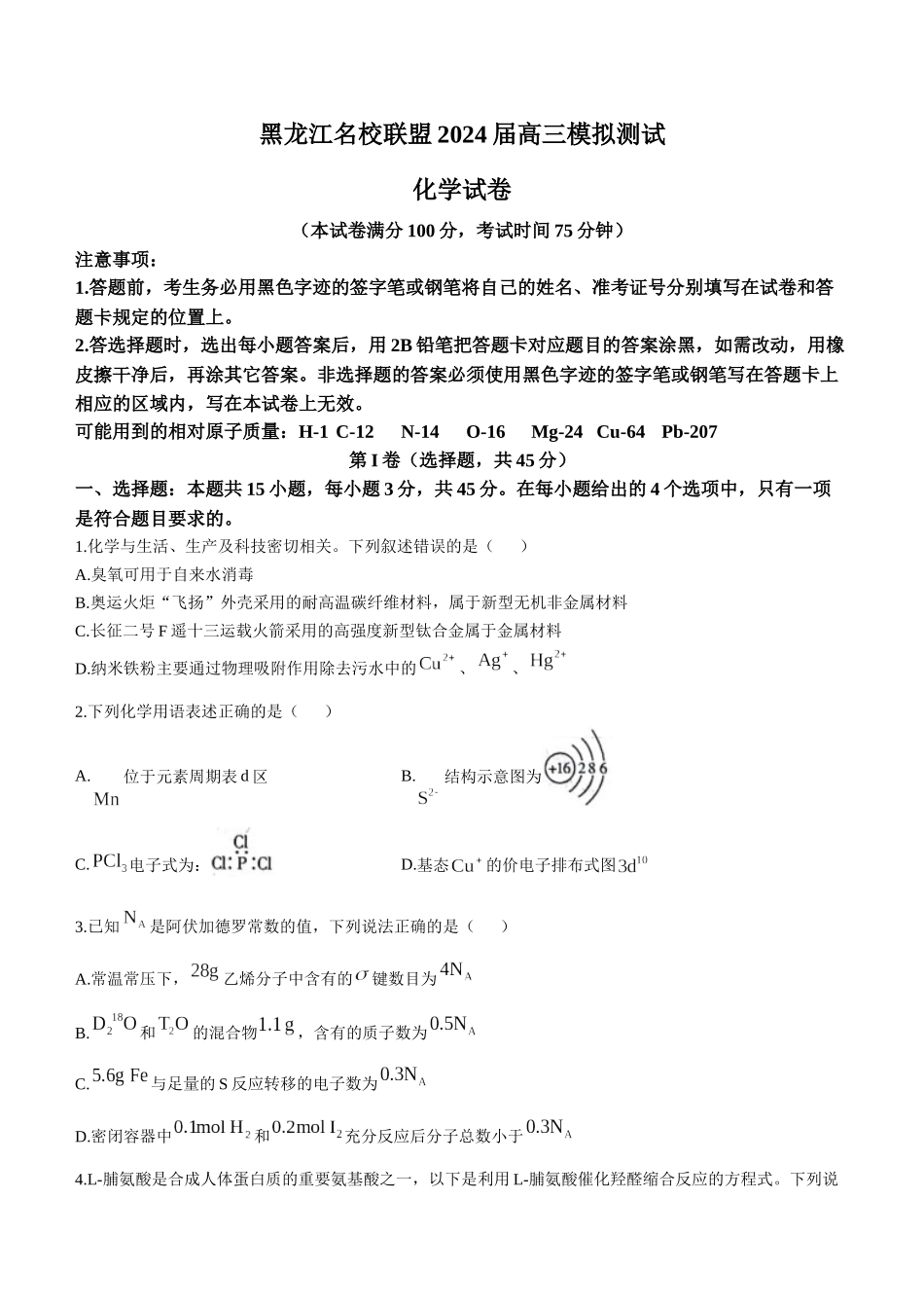 黑龙江名校联盟2024 届高三模拟测试化学.docx_第1页