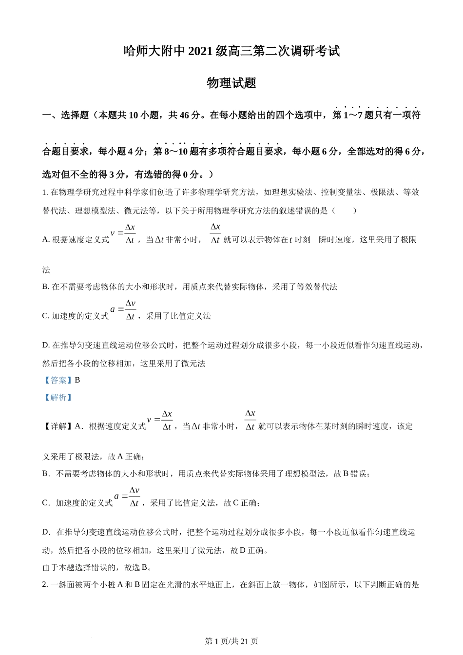 哈师大附中2021级高三第二次调研考试物理试题一、选择题(本题共10小题,共46分。在每小题给出的四个选项中,第1~7题只有一项符合题目要求,每小题4分;第8~10题有多项符合题目要求,每小题6分,全部选对的得6...