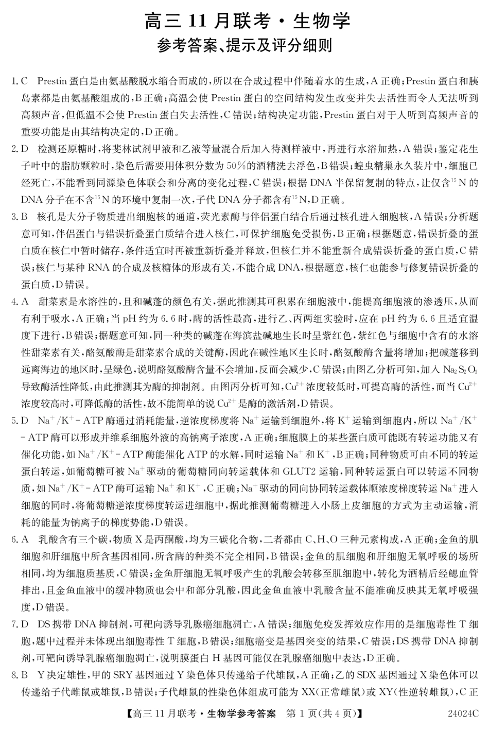 黑龙江省齐齐哈尔市普高联谊校2023-2024学年高三上学期11月月考 生物答案.pdf_第1页