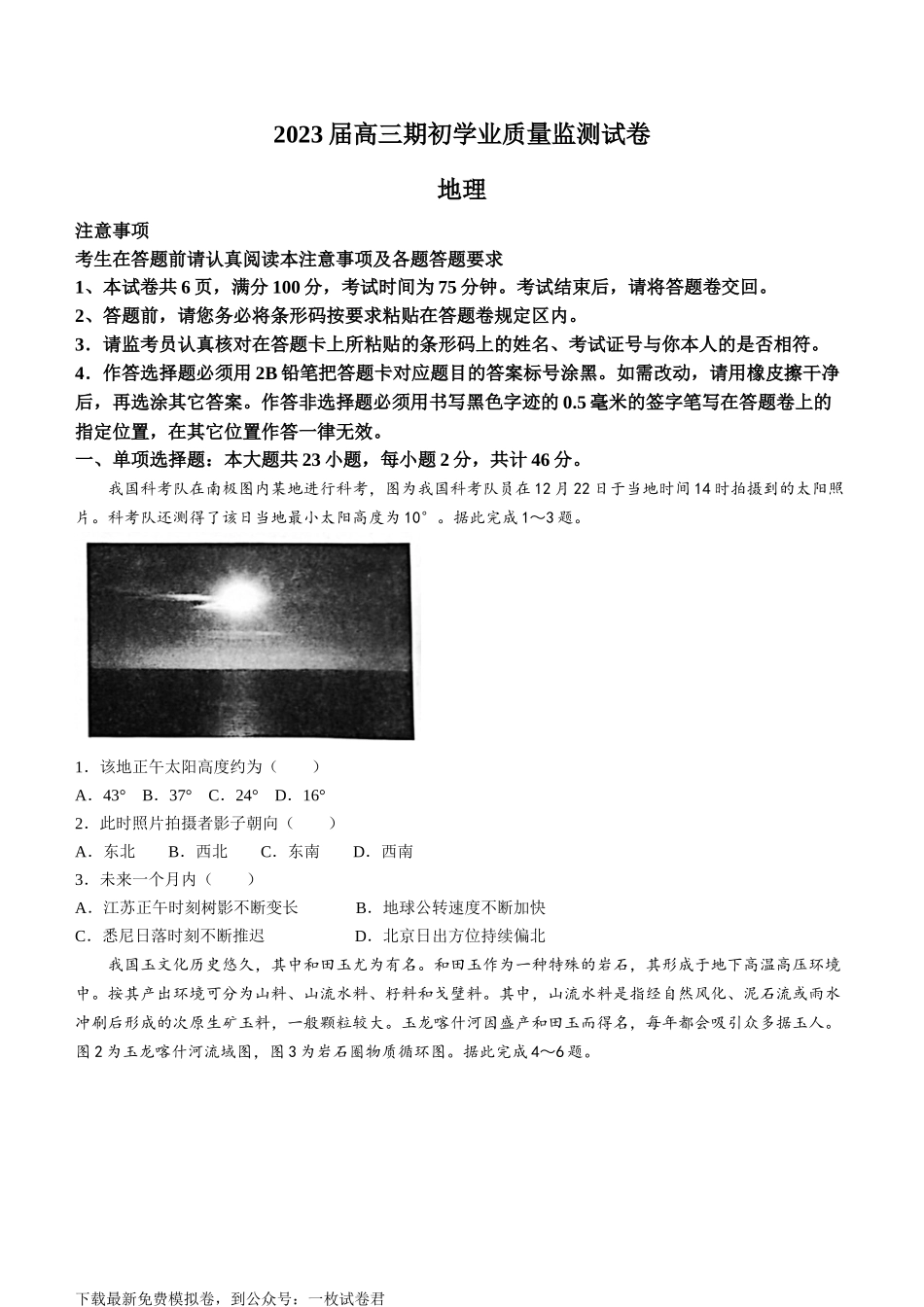2023届高三期初学业质量监测试卷地理注意事项考生在答题前请认真阅读本注意事项及各题答题要求1、本试卷共6页,满分100分,考试时间为75分钟。考试结束后,请将答题卷交回。2、答题前,请您务必将条形码按要求粘...