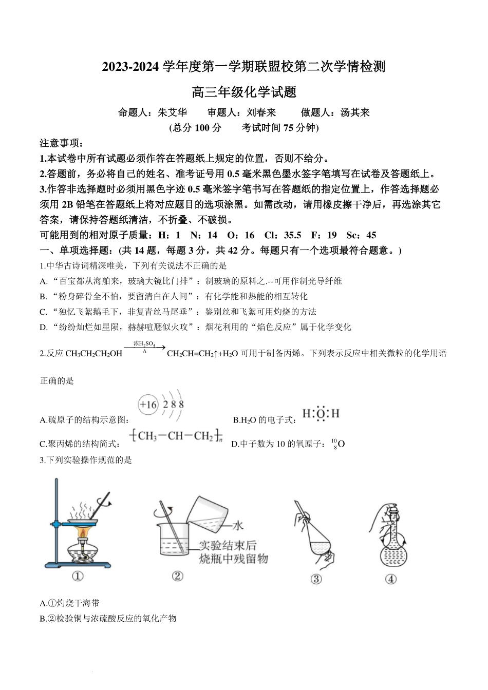 2023-2024学年度第一学期联盟校第二次学情检测高三年级化学试题命题人:朱艾华审题人:刘春来做题人:汤其来(总分100分考试时间75分钟)注意事项:1.本试卷中所有试题必须作答在答题纸上规定的位置,否则不给分。2...