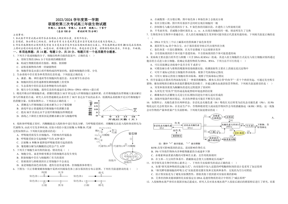 葡萄糖2023/2024学年度第一学期联盟校第三次考试高三年级生物试题命题人:徐培凤审题人:吕亚明做题人:丁家宁(总分100分考试时间75分钟)注意事项:1.本试卷中所有试题必须作答在答题纸上规定的位置,否则不给分...