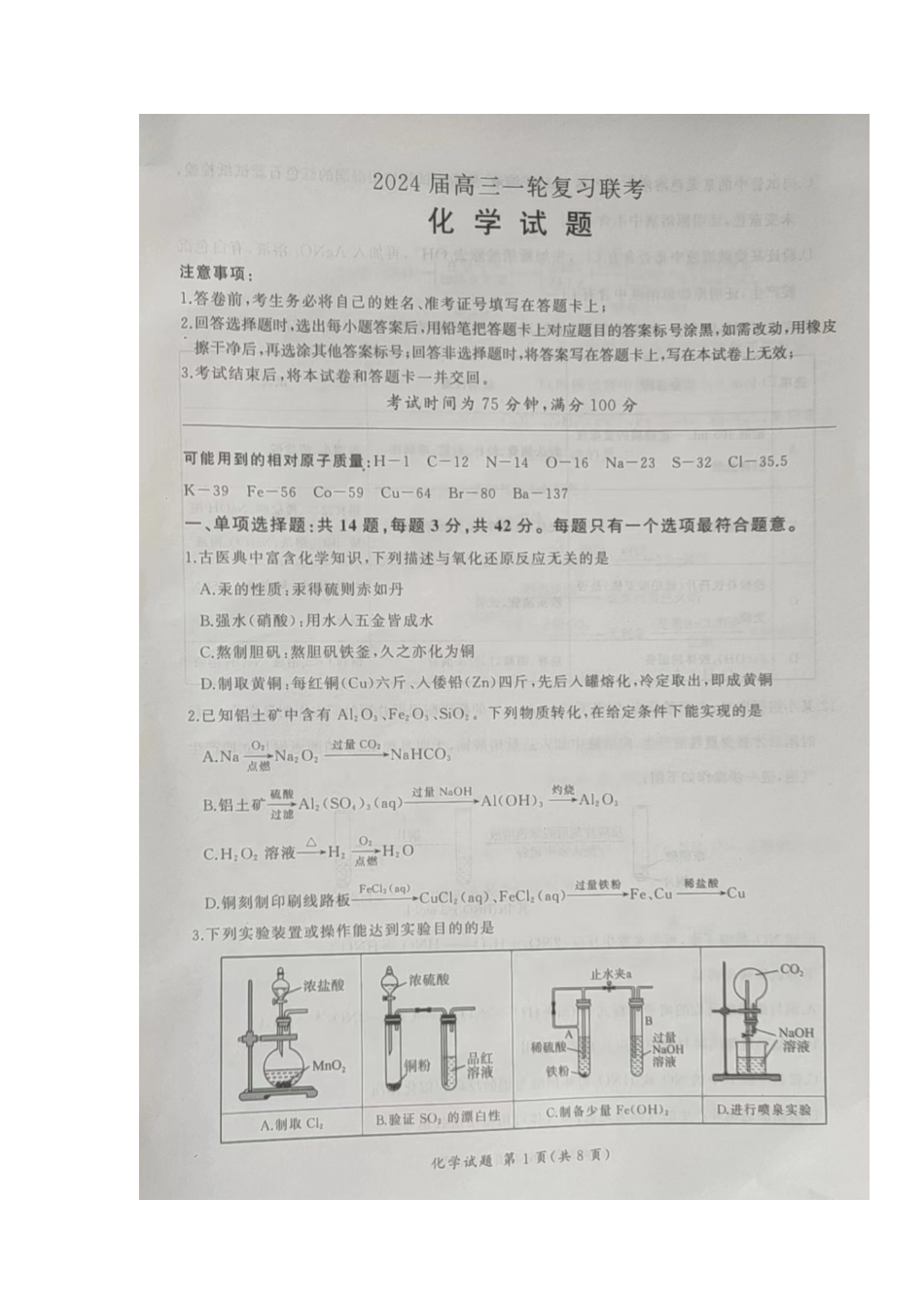 江西百师联盟高三(一轮复习考)-化学试题+答案.pdf_第1页