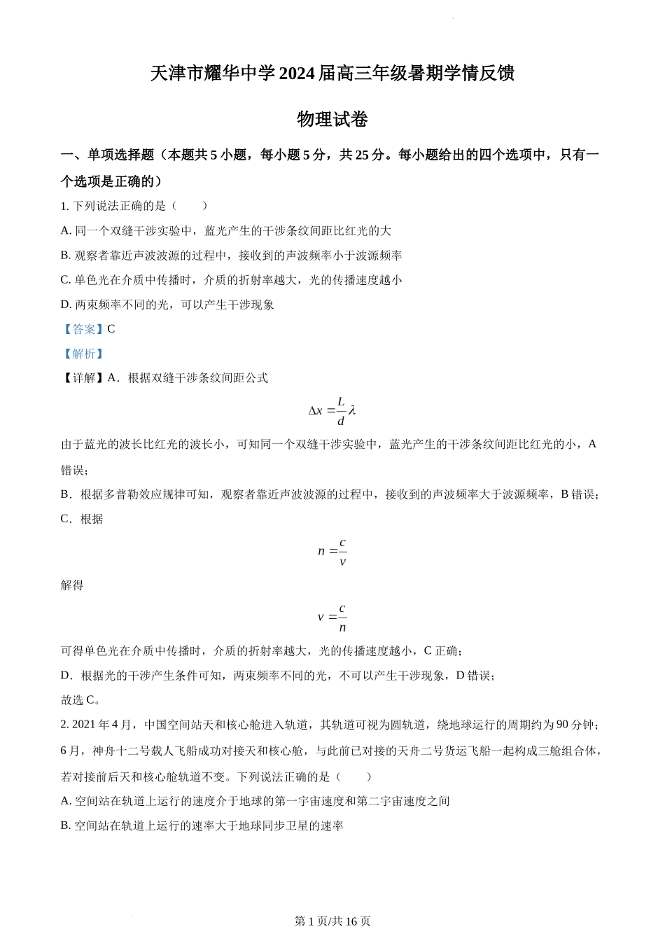 天津市耀华中学2024届高三年级暑期学情反馈物理试卷一、单项选择题(本题共5小题,每小题5分,共25分。每小题给出的四个选项中,只有一个选项是正确的)1.下列说法正确的是()A.同一个双缝干涉实验中,蓝光产生...