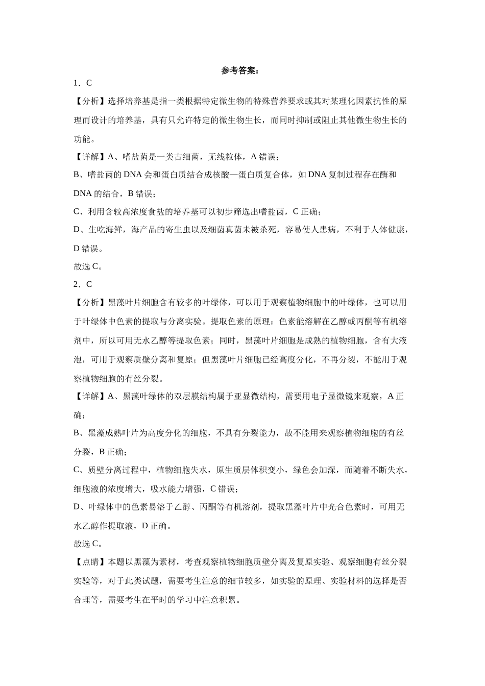 参考答案:1.C【分析】选择培养基是指一类根据特定微生物的特殊营养要求或其对某理化因素抗性的原理而设计的培养基,具有只允许特定的微生物生长,而同时抑制或阻止其他微生物生长的功能。【详解】A、嗜盐菌是一...