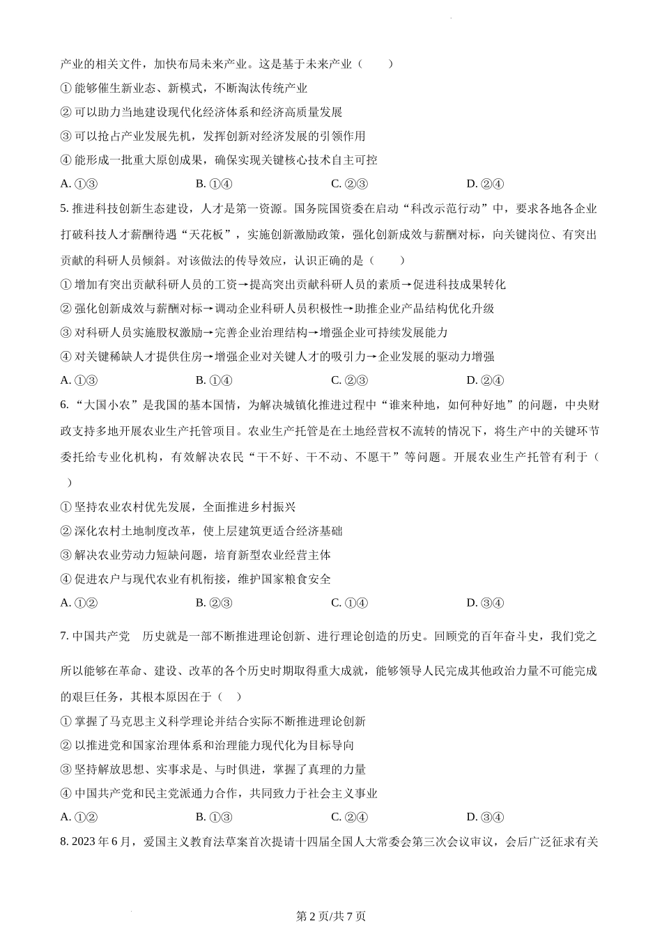 政治试题一、选择题:本题包括15小题,每小题3分,共45分。在每小题给出的四个选项中,只有一项符合题目要求。1.马克思在1867年问世的《资本论》中写到:“生产资料的集中和劳动的社会化,达到了同它们的资本主义...