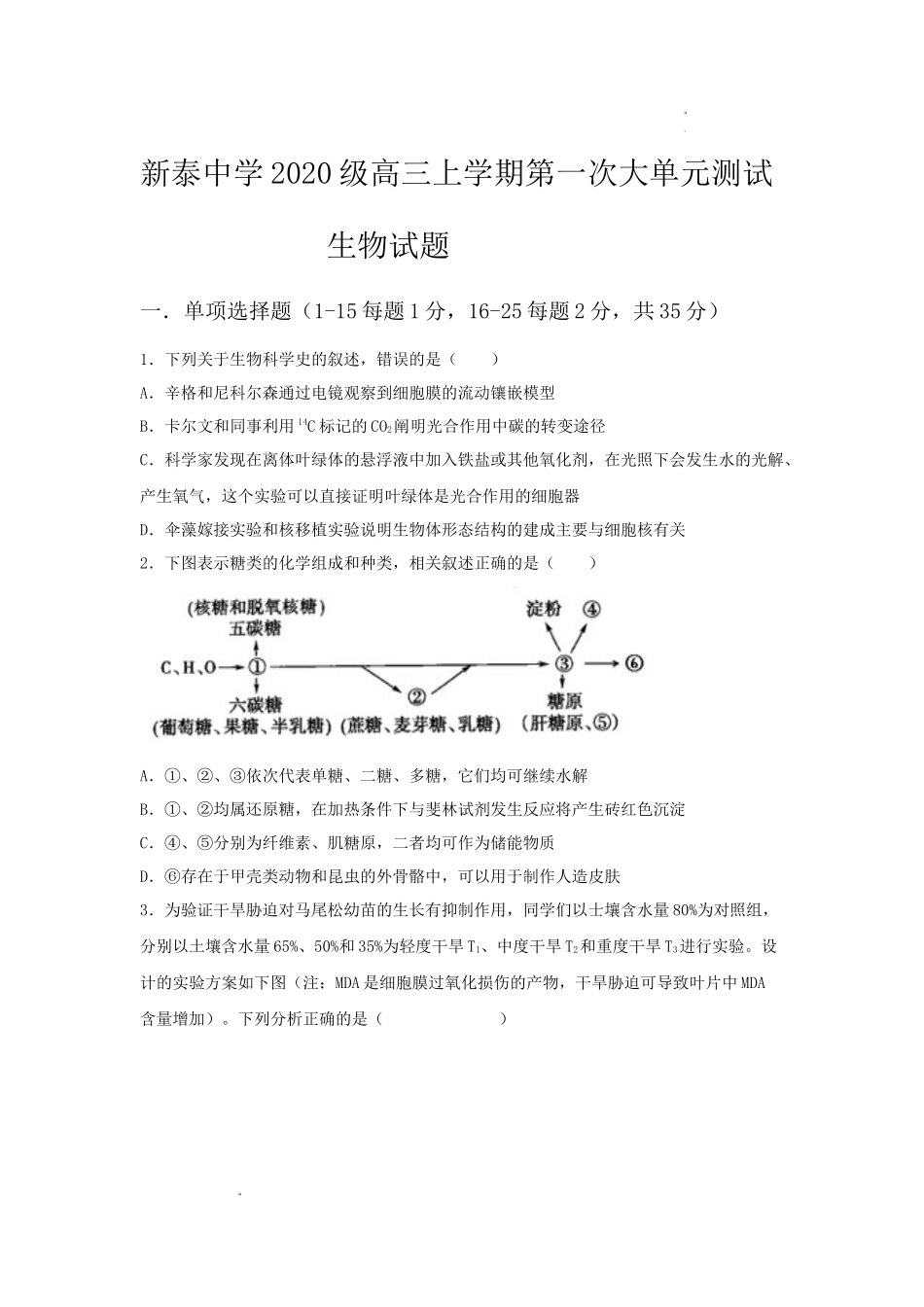 新泰中学2020级高三上学期第一次大单元测试生物试题一.单项选择题(1-15每题1分,16-25每题2分,共35分)1.下列关于生物科学史的叙述,错误的是()A.辛格和尼科尔森通过电镜观察到细胞膜的流动镶嵌模型B.卡...
