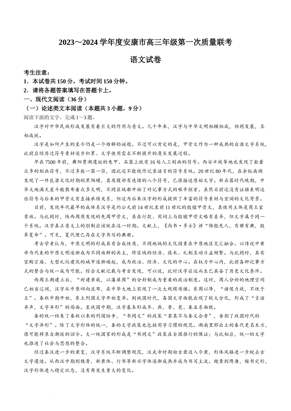 2023~2024学年度安康市高三年级第一次质量联考语文试卷考生注意:1.本试卷共150分,考试时间150分钟。2.请将各题答案填写在答题卡上。一、现代文阅读(36分)(一)论述类文本阅读(本题共3小题,9分)阅读下...