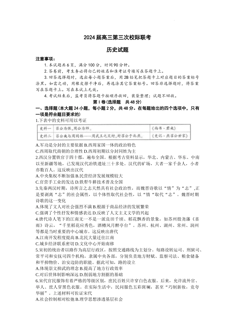 2024届高三第三次校际联考历史试题注意事项:1.本试题共6页,满分100分,时间90分钟。2.答卷前,考生务必将白己的姓名和准考证号填写在答题卡上。3.回答选择题时,选出每小题答案后,用2B铅笔把答题卡上对应题目...