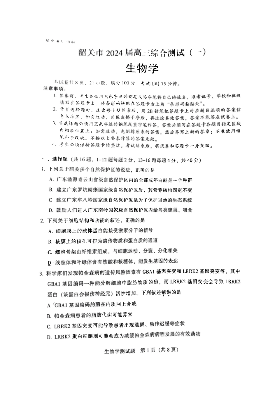 韶关市2024届高三综合测试(一)生物.pdf_第1页