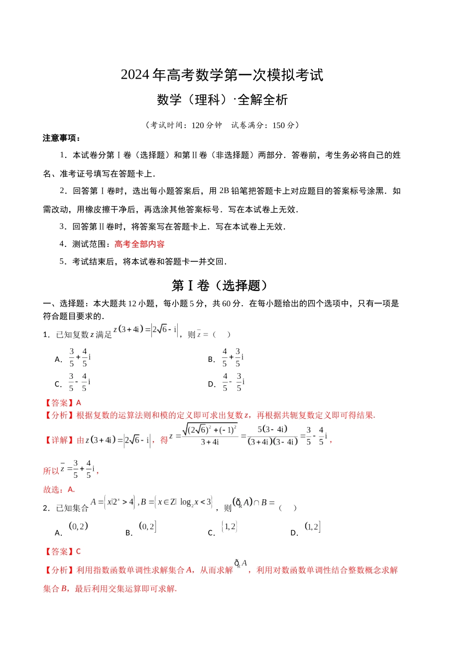 2024年高考数学第一次模拟考试数学(理科)·全解全析(考试时间:120分钟试卷满分:150分)注意事项:1.本试卷分第Ⅰ卷(选择题)和第Ⅱ卷(非选择题)两部分.答卷前,考生务必将自己的姓名、准考证号填写在答...