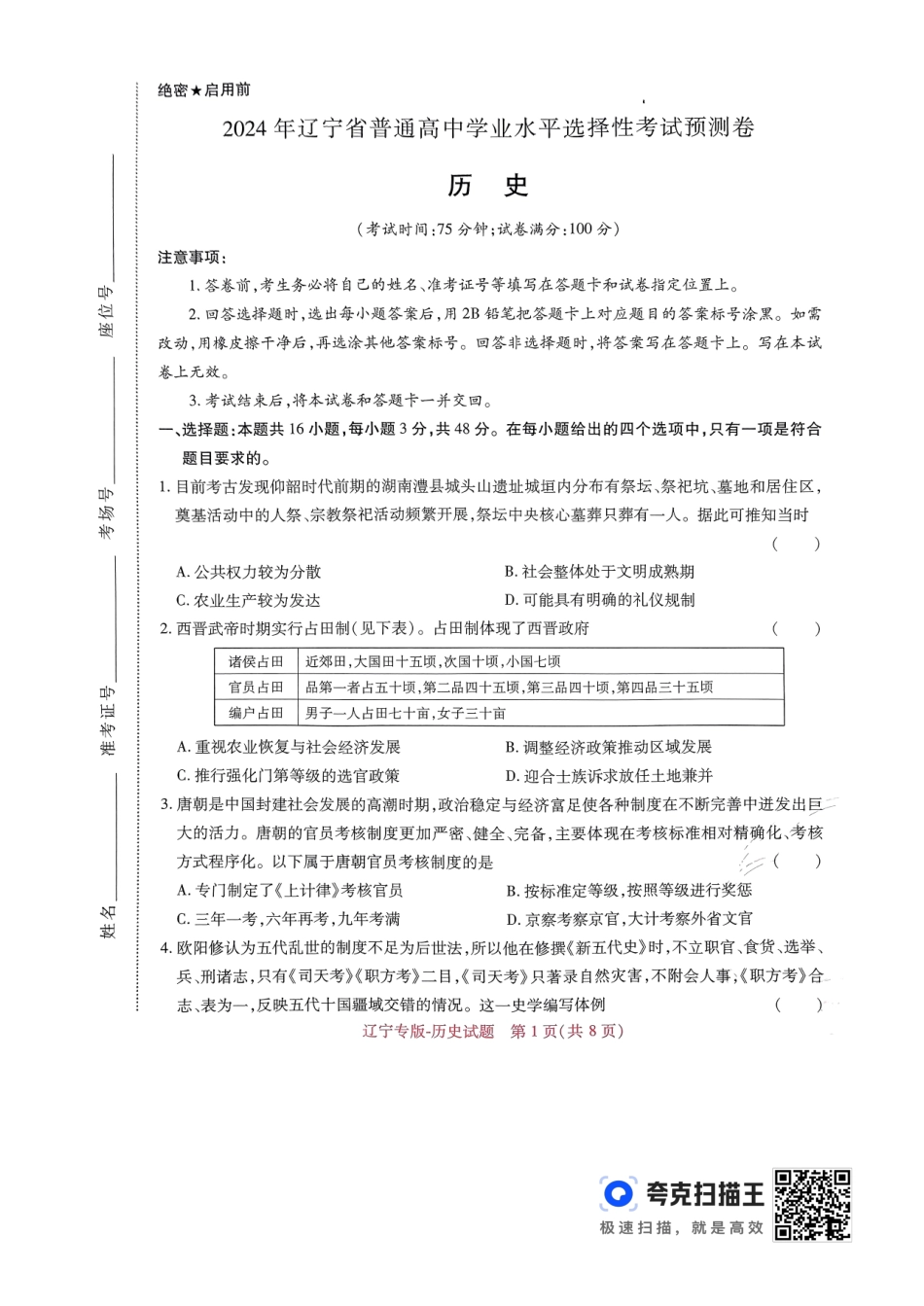 王后雄 高考押题预测卷 2024辽宁专版-历史.pdf_第1页