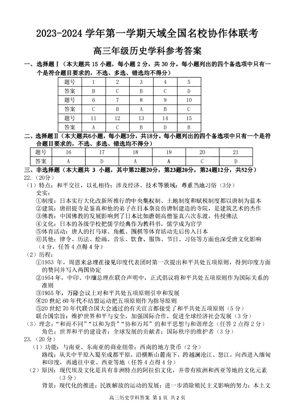 浙江省2024届第一学期天域全国名校协作体联考历史.pdf