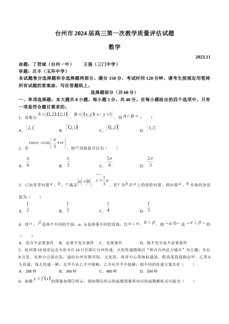 台州市2024届高三第一次教学质量评估试题数学2023.11命题:丁君斌(台州一中)王强(三门中学)审题:庄丰(玉环中学)本试题卷分选择题和非选择题两部分。满分150分,考试时间120分钟。请考生按规定用笔将所有试...