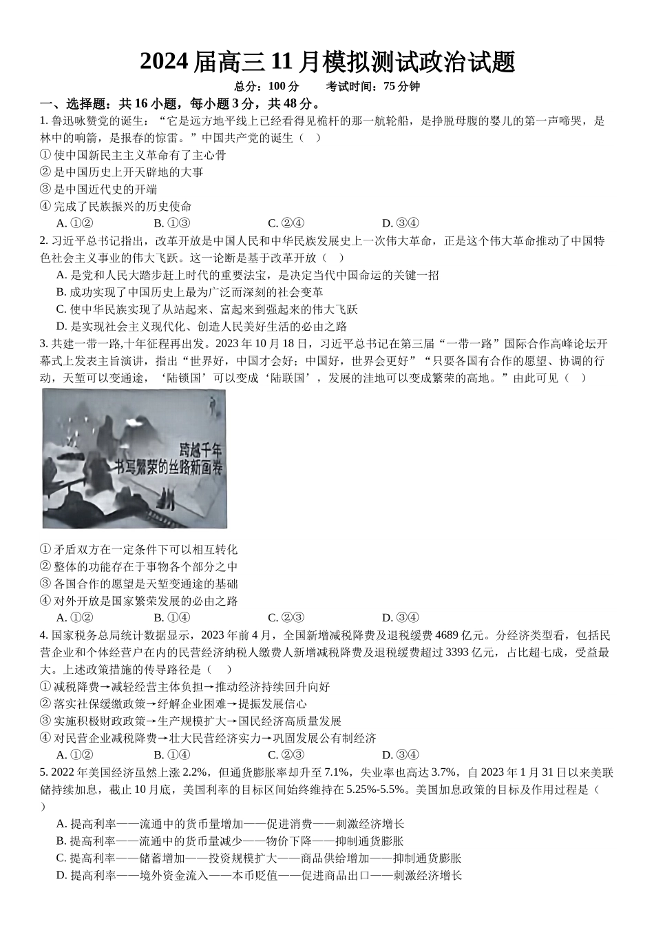 2024届高三11月模拟测试政治试题总分:100分考试时间:75分钟一、选择题:共16小题,每小题3分,共48分。1.鲁迅咏赞党的诞生:“它是远方地平线上已经看得见桅杆的那一航轮船,是挣脱母腹的婴儿的第一声啼哭,是...