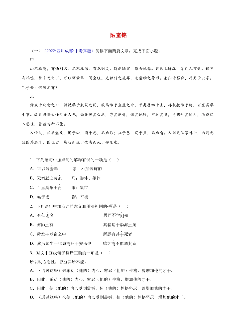 陋室铭(一)(2022·四川成都·中考真题)阅读下面两篇文章,完成下面小题。甲山不在高,有仙则名。水不在深,有龙则灵。斯是陋室,惟吾德馨。苔痕上阶绿,草色入帘青。谈笑有鸿儒,往来无白丁。可以调素琴,阅...