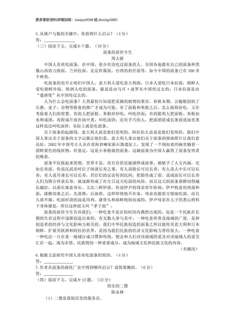 更多更新资料详情加微:xiaojuzi9598或zhixing168812014年福建省莆田市中考语文真题及答案(满分150分,考试时间120分钟)一、阅读(70分)(一)古诗文背诵。(10分)1.名句默写。(选填10处即可)(10分)(1)...