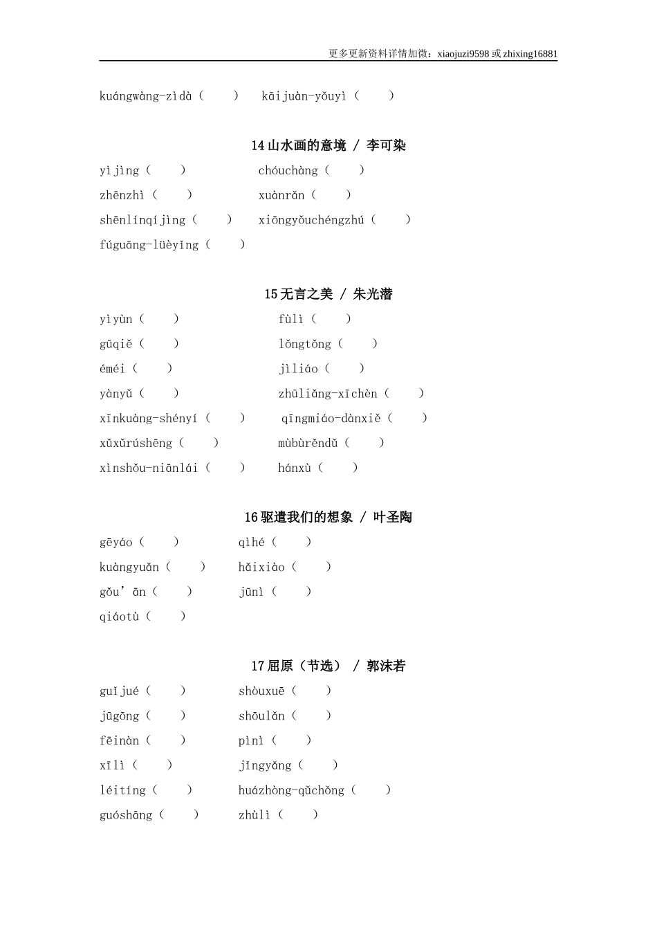 更多更新资料详情加微:xiaojuzi9598或zhixing16881九年级下册字音字形1祖国啊,我亲爱的祖国suìdònɡ()wōxíng()yūtān()bóchuán()cùxīn()xiàowō()pēnbó()shānghén-lěilěi()2梅...