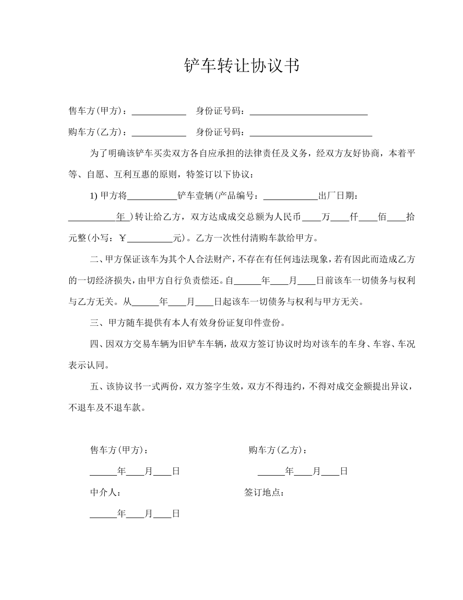 铲车转让协议书售车方(甲方):身份证号码:购车方(乙方):身份证号码:为了明确该铲车买卖双方各自应承担的法律责任及义务,经双方友好协商,本着平等、自愿、互利互惠的原则,特签订以下协议:1)甲方将铲车壹辆(...