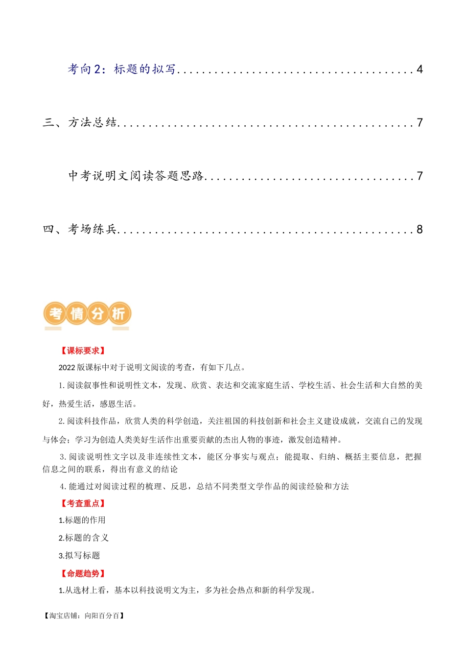 专题三现代文阅读第32讲说明文的标题目录一、考情分析...............................................2【课标要求】............................................2【考查重点】.................................
