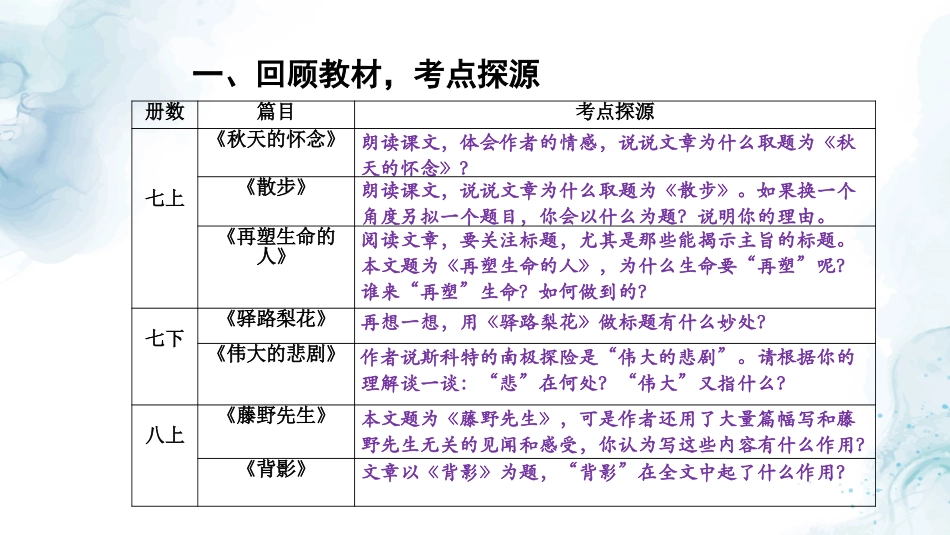 中考复习专题--标题理解一、回顾教材,考点探源册数篇目考点探源七上《秋天的怀念》朗读课文,体会作者的情感,说说文章为什么取题为《秋天的怀念》?《散步》朗读课文,说说文章为什么取题为《散步》。如果换一...
