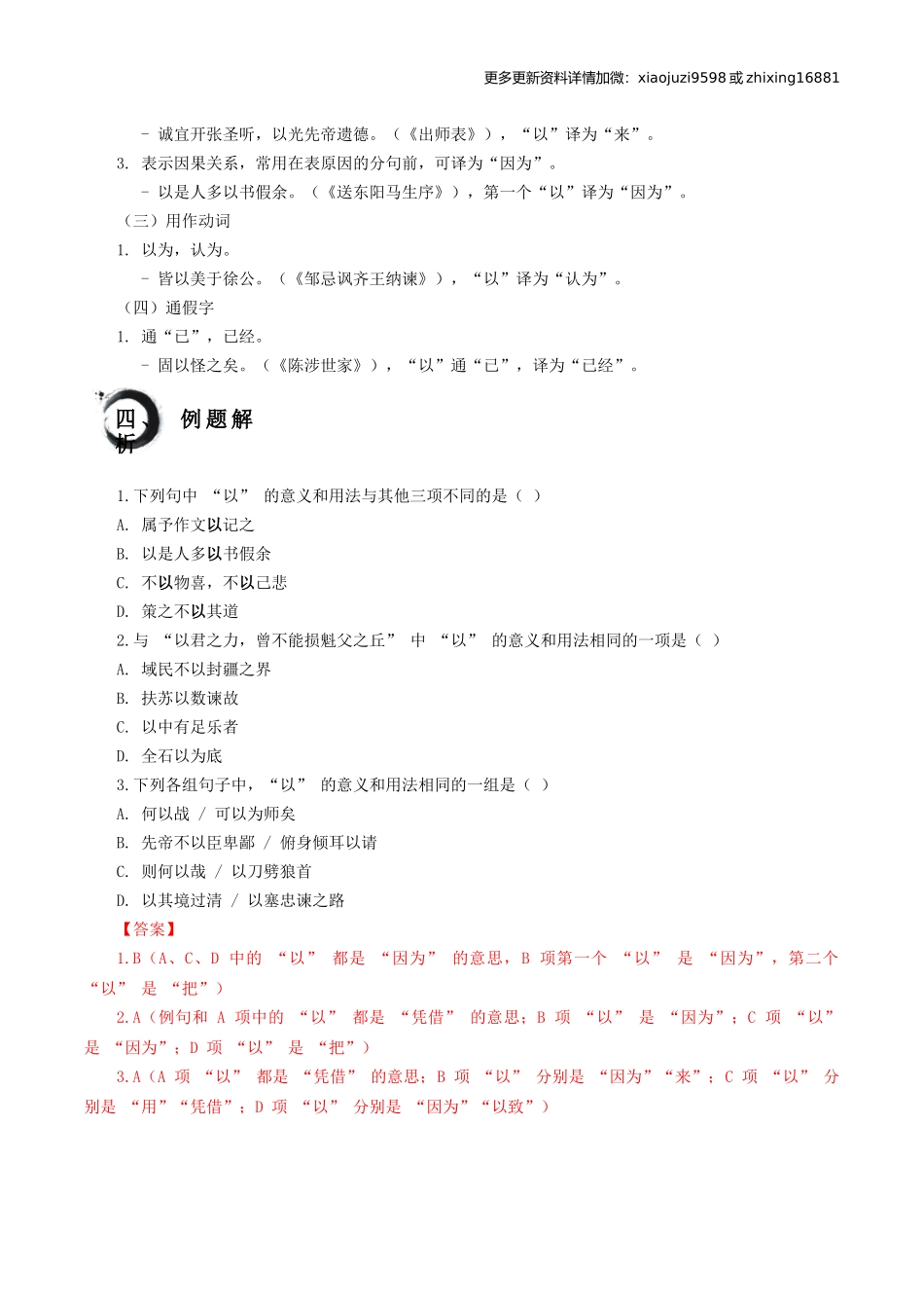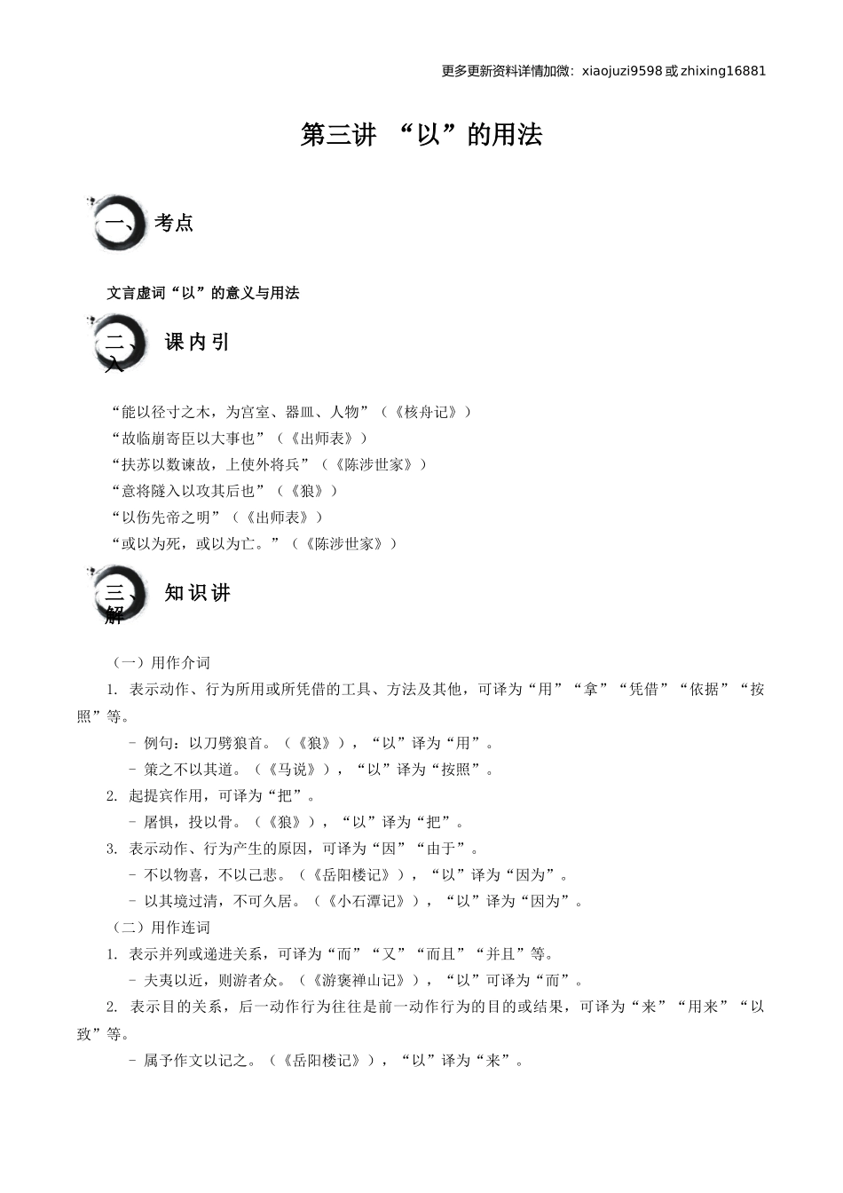 更多更新资料详情加微:xiaojuzi9598或zhixing16881第三讲“以”的用法文言虚词“以”的意义与用法“能以径寸之木,为宫室、器皿、人物”(《核舟记》)“故临崩寄臣以大事也”(《出师表》)“扶苏以数谏故,上...